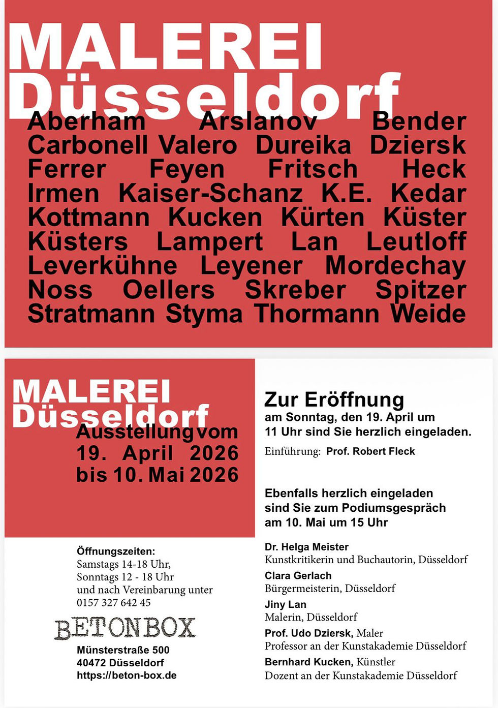 Laura Aberham, Rimma Arslanov, Andrea Bender, Carlota Carbonell Valero, Andrei Dureika, Udo Dziersk, Veit Ferrer, Harald Feyen, Kati Heck, Katie Irmen, Gabi Kaiser-Schanz, Tamara K.E., Dvir Cohen-Kedar, Markus Kottmann, Bernhard Kucken, Stefan Kürten, Andrea Küster, Franz Küsters, Kirsten Lampert, Jiny Lan, Vera Leutloff, Silke Leverkühne, Annette Leyener, Roy Mordechay, Stefan Noss, Edith Oellers, Dirk Skreber, Rene Spitzer, Veit Johannes Stratmann, Astrid Styma, Christoph Thormann, Gabriele Weide